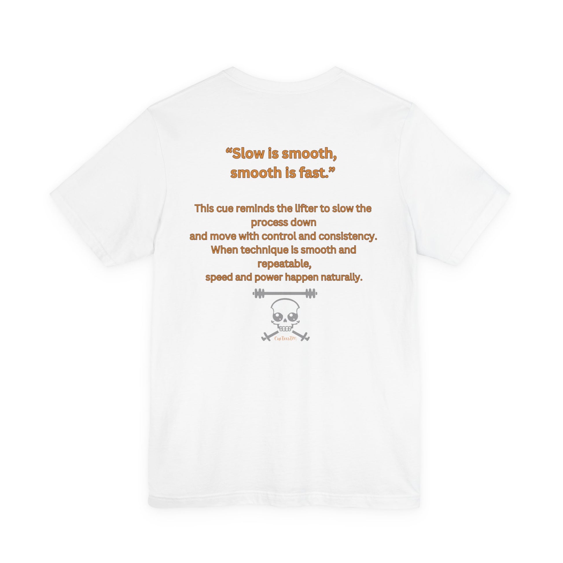 A lightweight, breathable tee designed for athletes who train with intent. This jersey short sleeve shirt puts a simple, focused message front-and-center — “Slow is smooth, smooth is fast” — paired with a silhouette of a weightlifter to remind you to prioritize controlled technique over rushed reps. The back expands on the cue with a concise training note and a small emblem, so the shirt works as both wearable motivation and a subtle coaching tool. Wear it for warm-ups, technique sessions, or recovery days when the goal is steady progress and cleaner movement.
