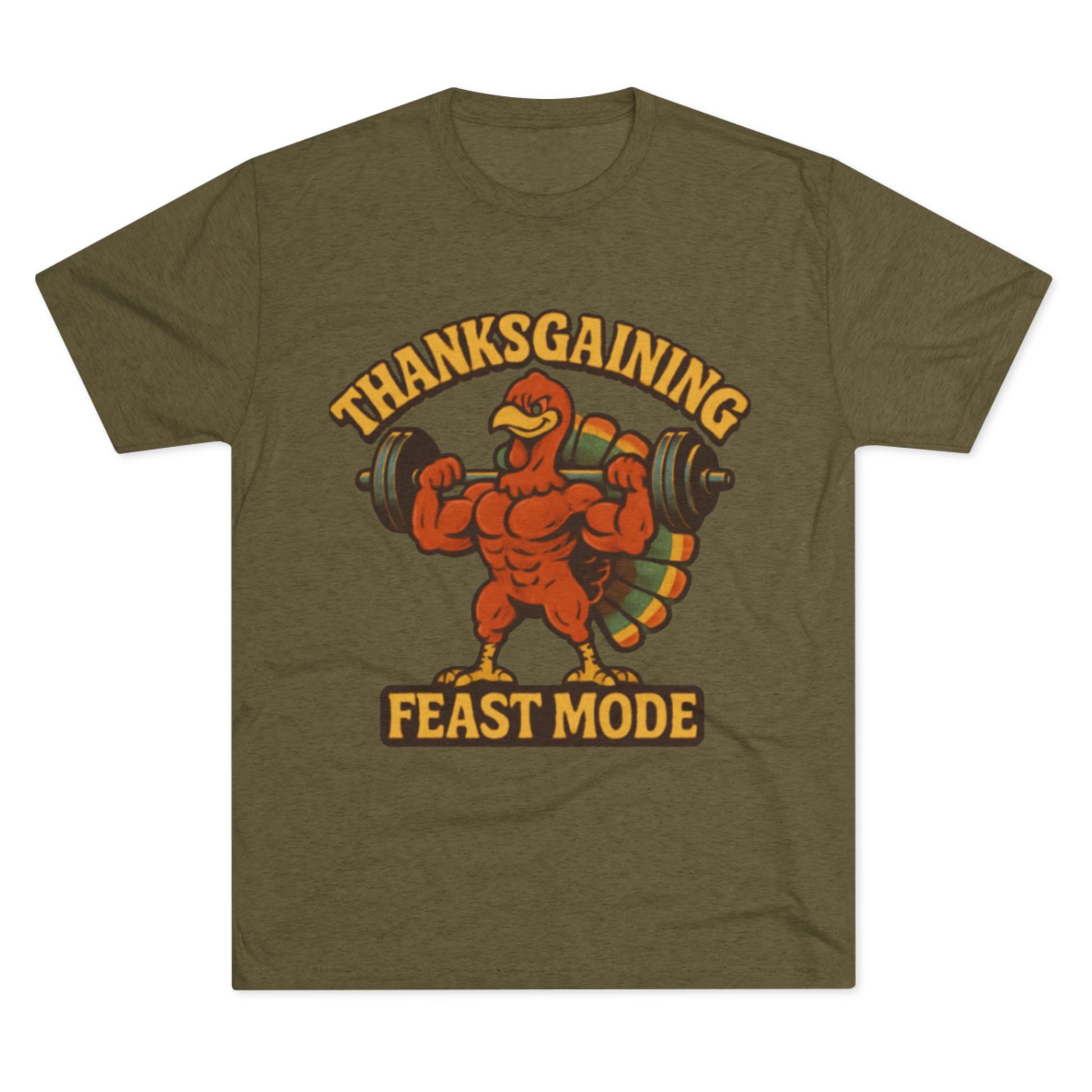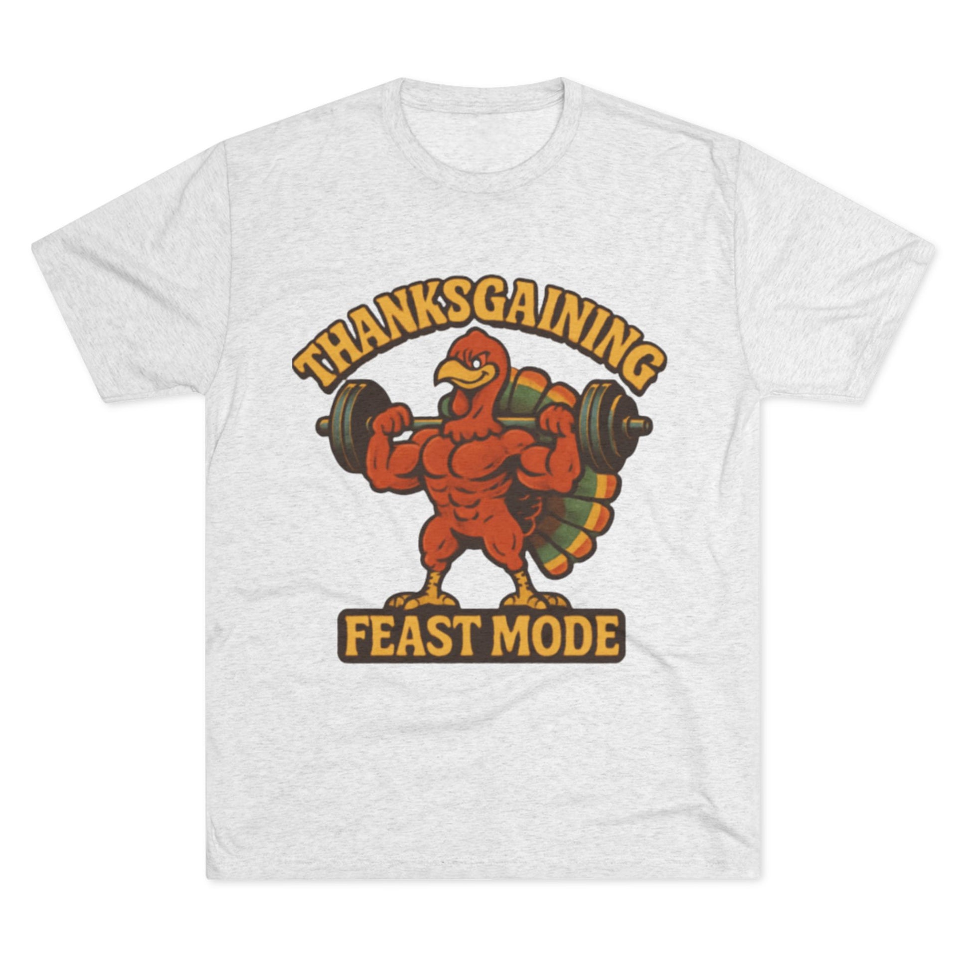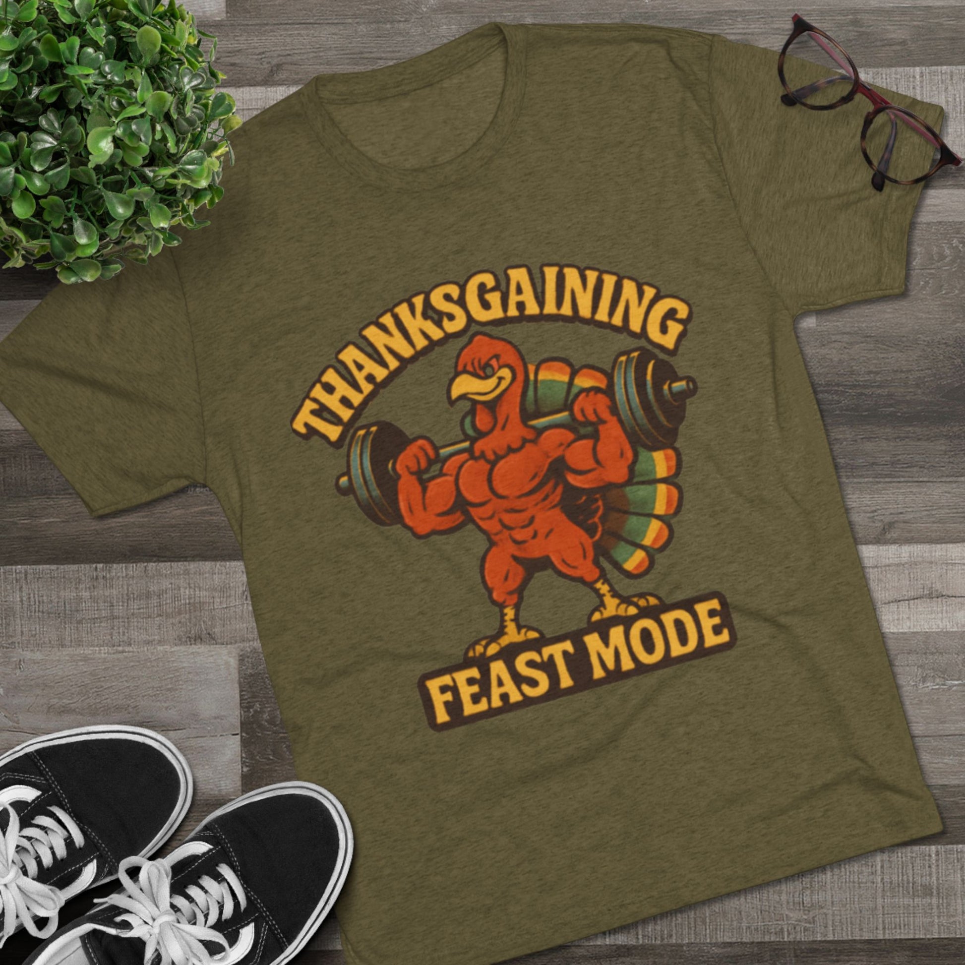 Slip into a soft, lightweight tee that brings humor and holiday hustle to your wardrobe. Featuring a buff cartoon turkey hoisting a loaded barbell, this shirt proudly declares βTHANKSGAININGβ across the top and βFEAST MODEβ below β a perfect mash-up of gym grit and Thanksgiving indulgence.