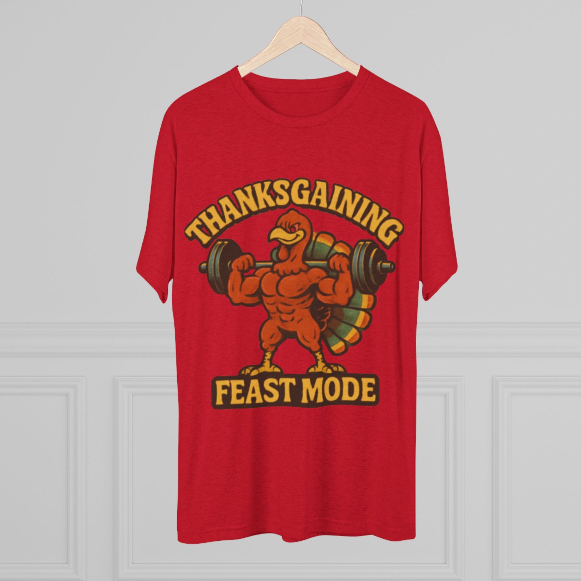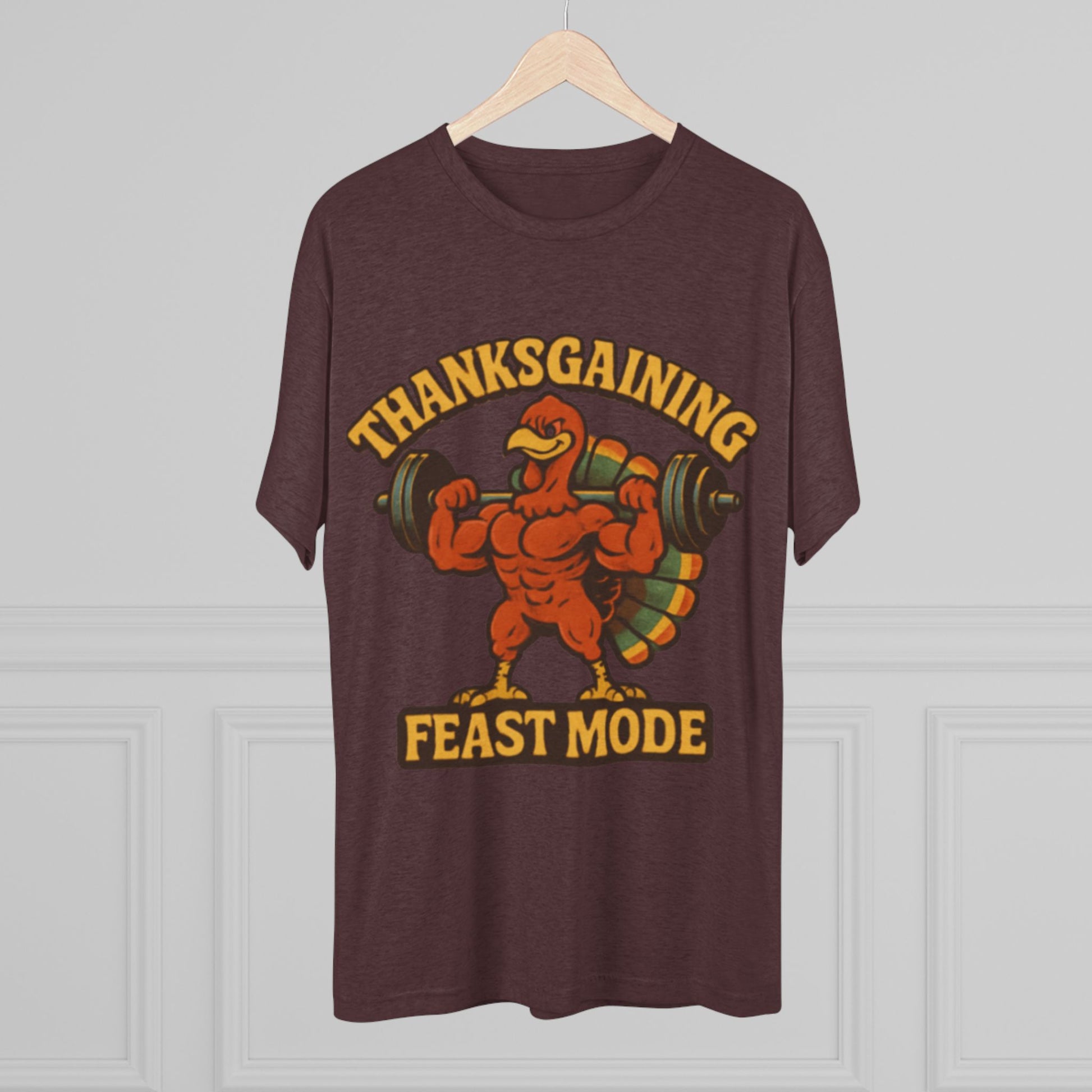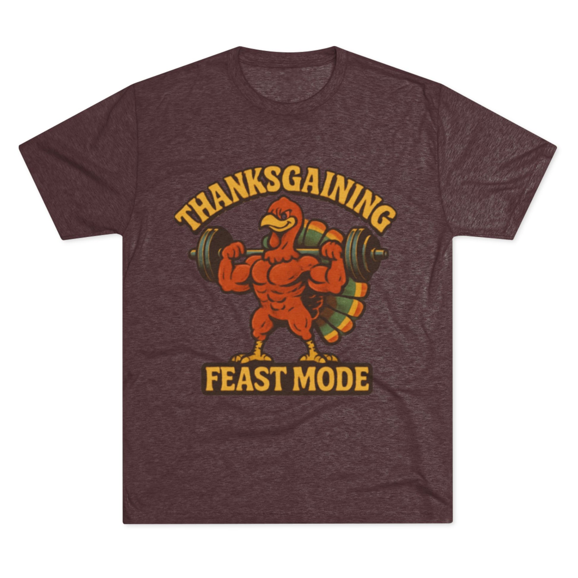 Slip into a soft, lightweight tee that brings humor and holiday hustle to your wardrobe. Featuring a buff cartoon turkey hoisting a loaded barbell, this shirt proudly declares βTHANKSGAININGβ across the top and βFEAST MODEβ below β a perfect mash-up of gym grit and Thanksgiving indulgence.