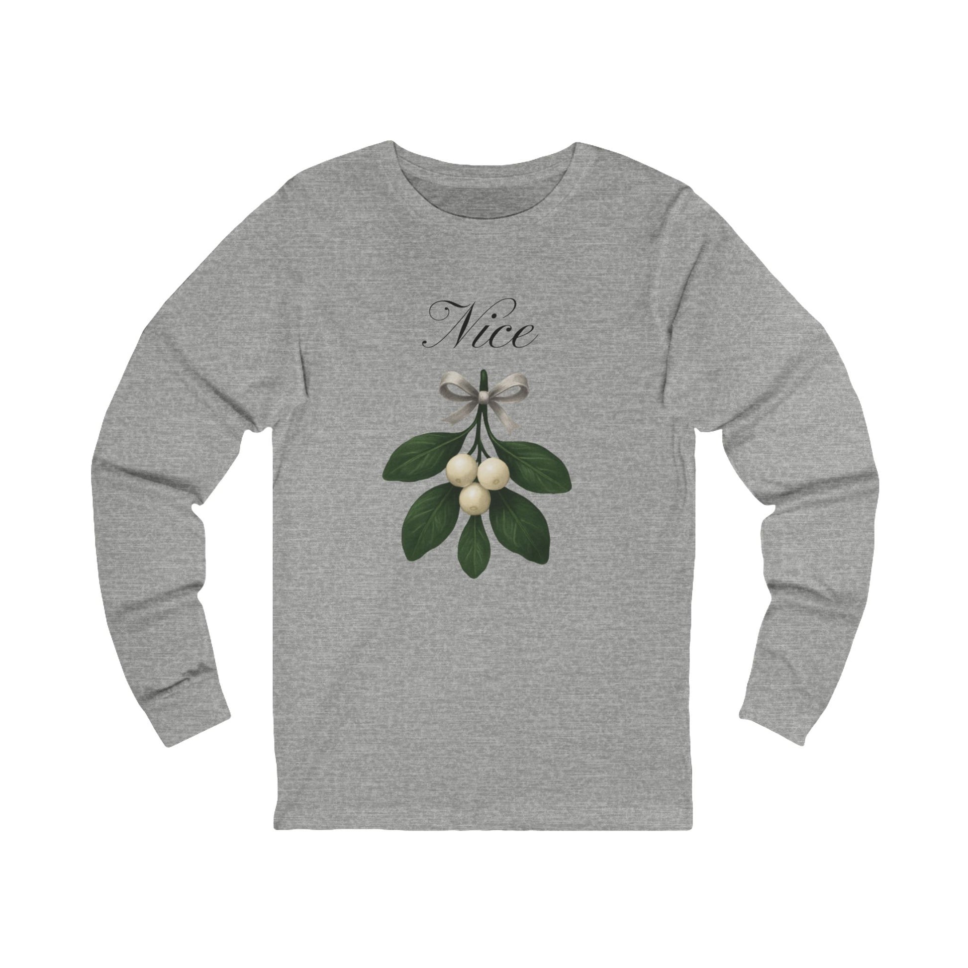 Soft, light, and quietly festive — this long sleeve tee carries a gentle holiday whisper. A delicate mistletoe illustration rests over the heart, tied with a slender bow and paired with elegant script that reads “Nice.” On the back, graceful lettering leaves room for a personalized name, so the shirt feels like something made just for you. The fabric is breathable and fine, draping with a retail fit that works layered under a cardigan or worn alone on crisp mornings. Wear it to low-key gatherings, holiday card photos, or while wrapping presents to add a subtle, classic touch of seasonal charm.