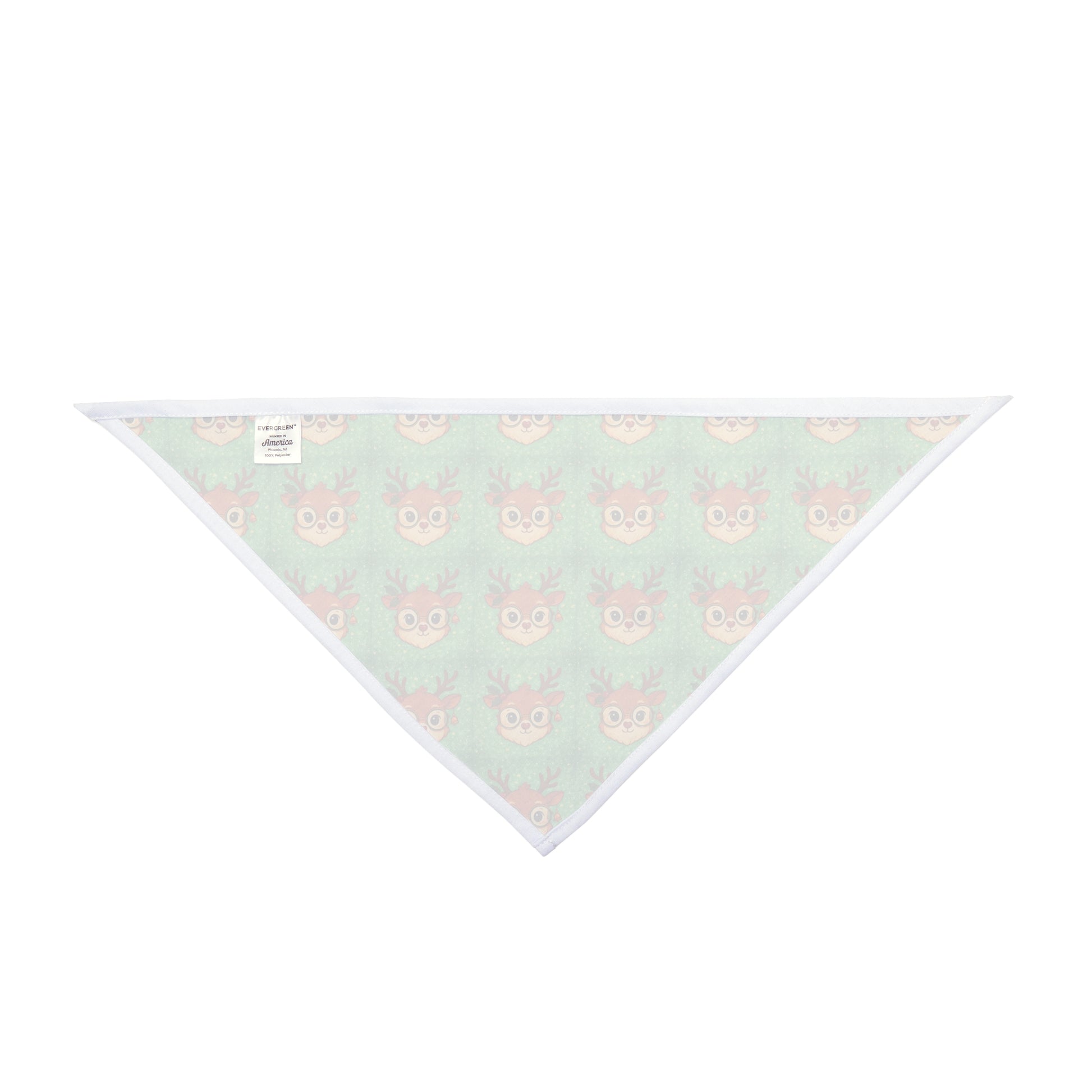 Let your furry friend wear a little joy. This triangular bandana shows a repeating, hand-drawn deer-face pattern on a warm green field — playful and a touch rustic. It sits neatly around a collar or ties at the neck, adding character on walks, at family gatherings, or during cozy holiday photos. The lightweight polyester keeps its shape and dries fast after puddle-play or bath time. Hemmed edges and a sewn label give it a finished look that holds up to wagging and romping. It’s for pet parents who love cottagecore charm with everyday practicality.