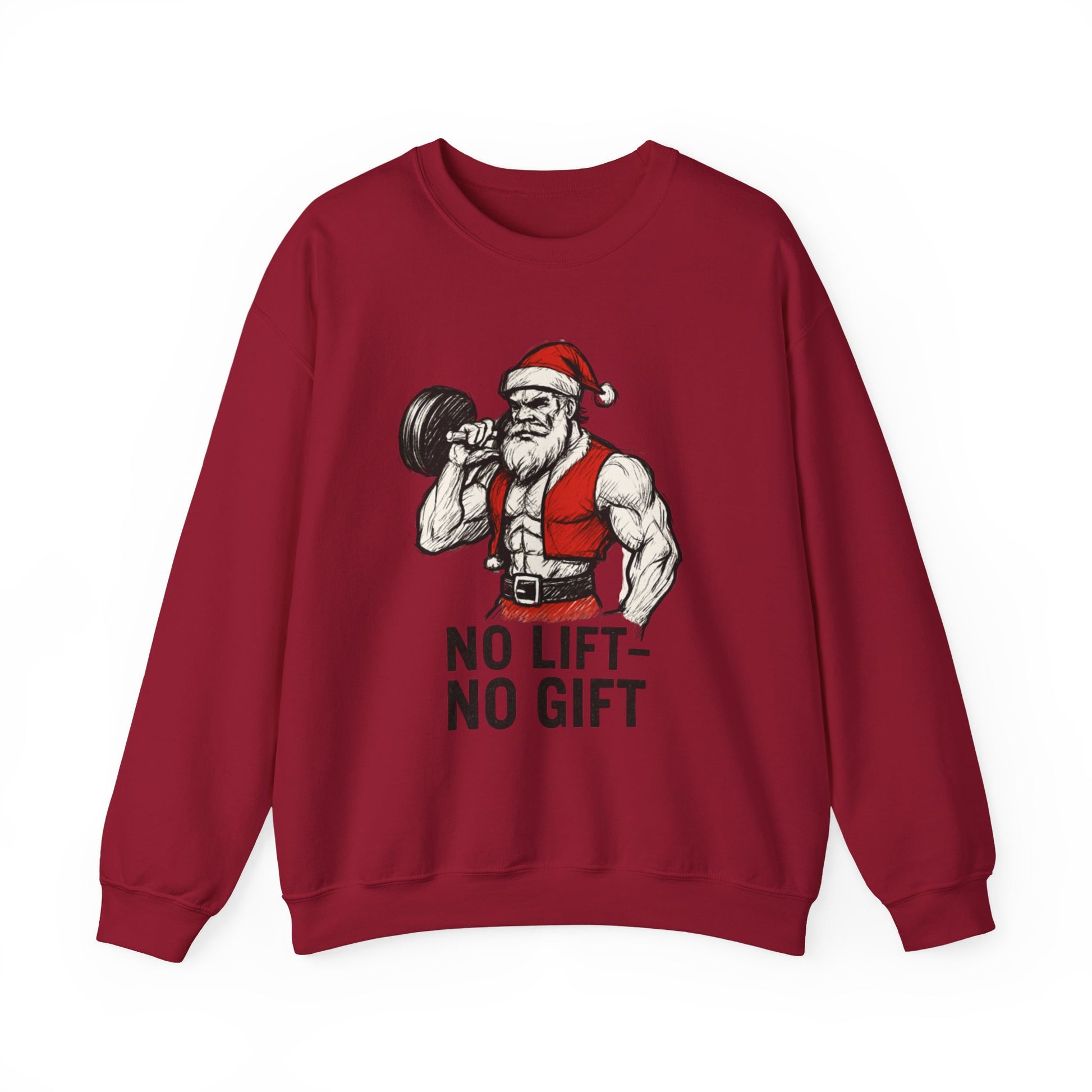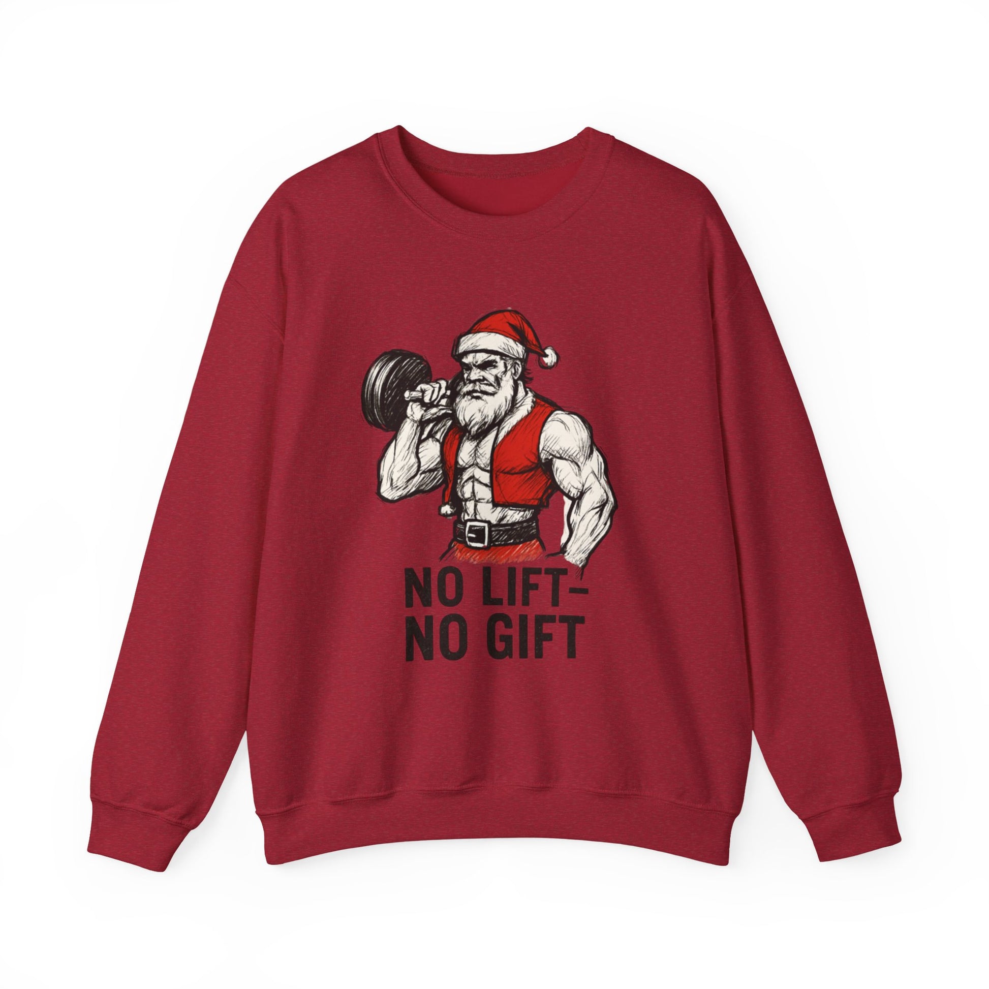 This mid-weight cotton-poly sweatshirt brings the same energy you do—strong, steady, and ready for work. The front features a hand-drawn jacked Santa curling a dumbbell above the bold slogan “NO LIFT — NO GIFT,” combining classic holiday grit with gym-rat humor.
